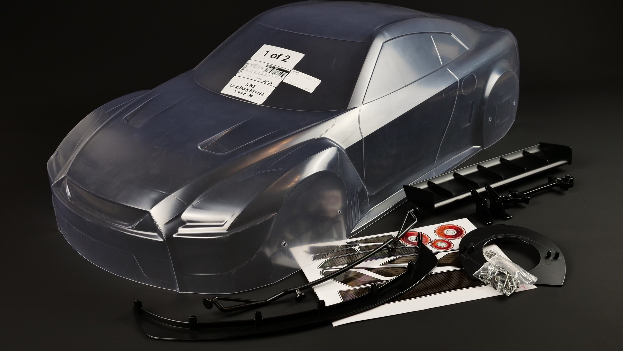 Komplettes Nissan GT (R35 SKYLINE) Set mit Heckflügel und zubehör aus 1.5mm lexan. Passend für 535mm Radstand. Nicht lackiert.